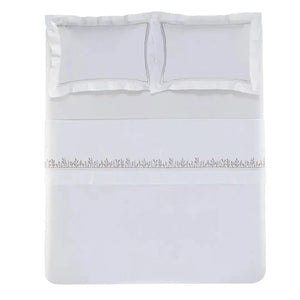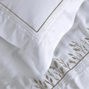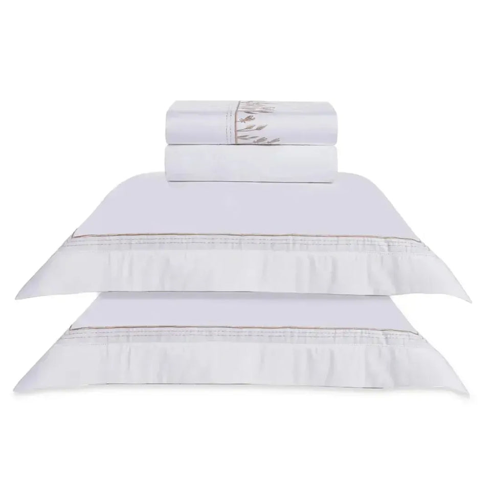 Combinação de Cores: corpo branco com bordado localizado emoldutando as fronhas e sobre lençol com pequenos ramos de flores