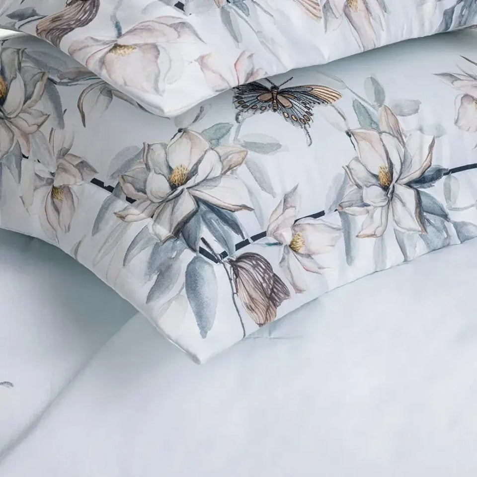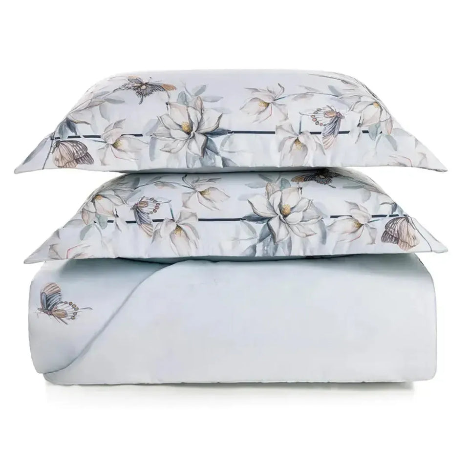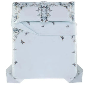 Combinação de Cores: Fundo azul claro com estampa dimensionada na colcha e porta travesseiro retratando borboletas e flores nas beiradas da moldura