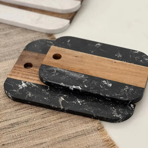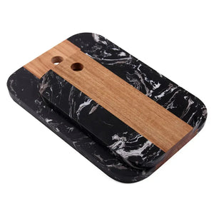 Ideal para disposição de petiscos, frios, queijos, acompanhamentos dos aperitivos, entre outros, esse Conjunto com 2 Tábuas para Aperitivo com Furo de Pendurar de Madeira e Mármore Preto garante uma mesa posta convidativa, sofisticada e elegante.