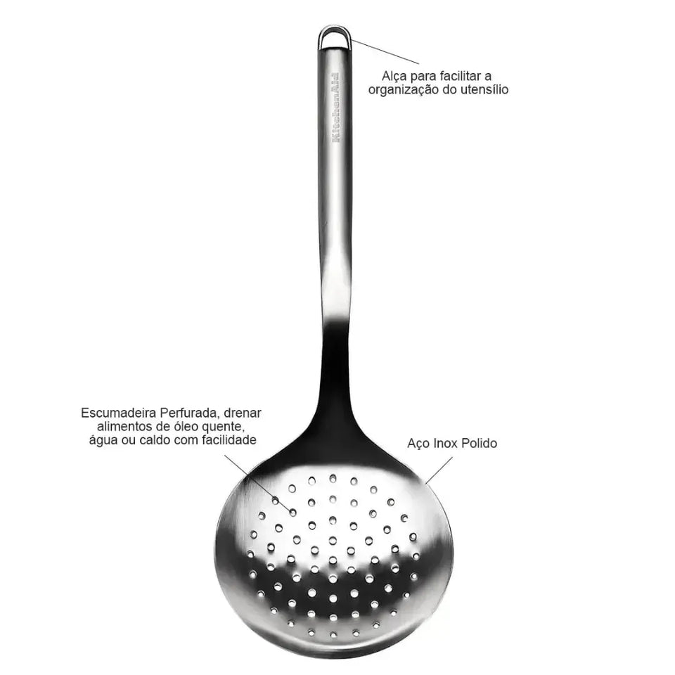 A Escumadeira Luxo Premium de Inox com Alça da Kitchenaid é um utensílio indispensável para quem busca praticidade e eficiência na cozinha. Ideal para escorrer alimentos de óleos, caldos ou água quente com facilidade, ela é fabricada em aço inoxidável, garantindo durabilidade, resistência e um visual moderno que combina com qualquer estilo de cozinha. Perfeita para o uso diário, também pode ser lavada na máquina de lavar louça, tornando a limpeza muito mais prática.