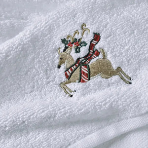 Combinação de Cores: Branco com bordado de rena dourado, vermelho e verde