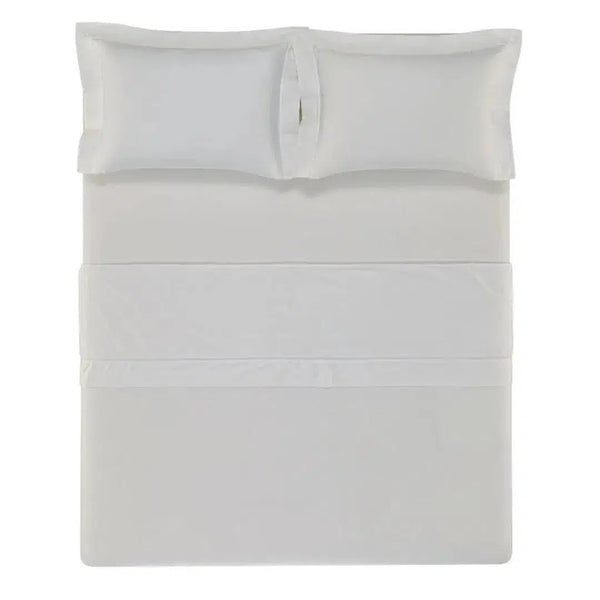 Acabamento: Tecido mercerizado; Fronha com 3 abas e entremeio bordado de algodão; Dobra feita com entremeio bordado de algodão; Lençol de baixo com elástico liso; Toque acetinado