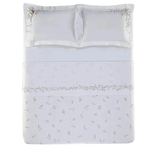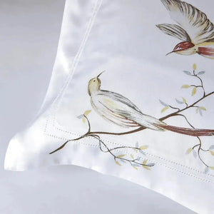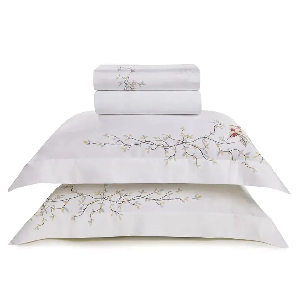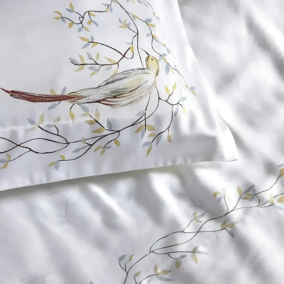 Combinação de Cores: Corpo branco com estampa dimensionada exclusiva na fronha formando o lado ele/ela representando um pássaro dançando sobre folhagens azuis e amarelas em um emaranhado de galhos. O sobre lençol, apresenta a mesma folhagem em sua frente e um emaranhado de galhos conectados na dobra feita