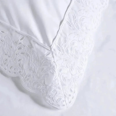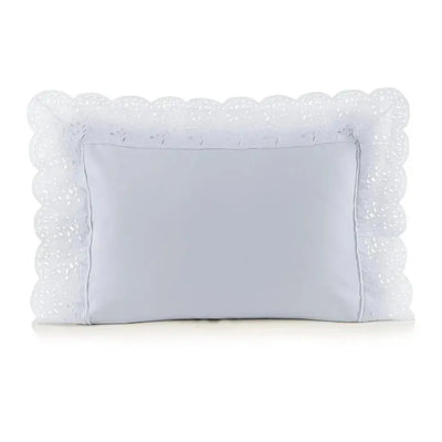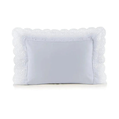 Acabamento: Fronha com 3 abas, tira bordada aplicada e canto inglês, Dobra feita com barrado bordado, Colcha com matelassado, Lençol com elástico.