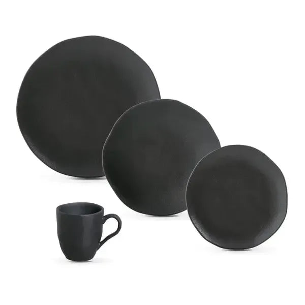 Produzidas em stoneware de alta performance, as louças reproduzem a mesma beleza bruta orgânica que consolidou a linha: um preto fosco imponente e autêntico com acabamento matte combinado à solidez características de uma peça artesanal com textura suave ao toque, um design com formas assimétricas, irregulares e exclusivas, e uma estética minimalista e refinada que confere presença marcante à mesa.